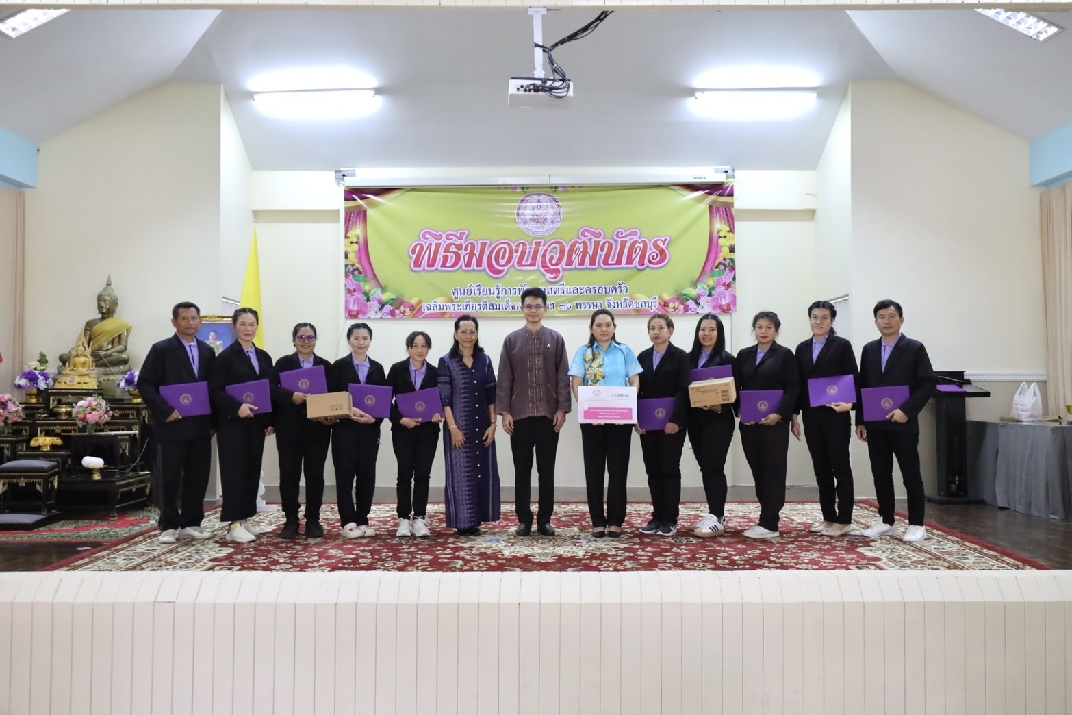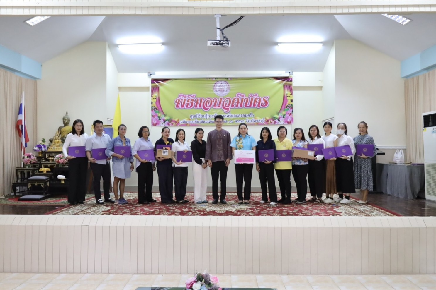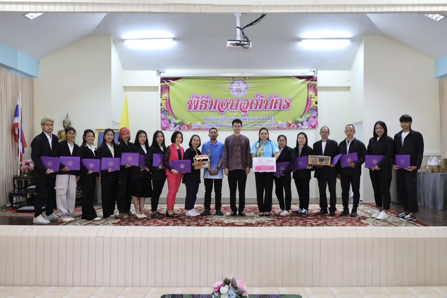 วันที่ 28 กุมภาพันธ์ 2568 เวลา 13.30 น. ณ อาคารอเนกประสงค์ ศูนย์เรียนรู้การพัฒนาสตรีและครอบครัวเฉลิมพระเกียรติสมเด็จพระเทพฯ 36 พรรษา จังหวัดชลบุรี นายนัธทวัฒน์ ธนโชติชัยพัชร์ ผู้อำนวยการศูนย์ฯ เป็นประธานมอบวุฒิบัตร และกล่าวให้โอวาทแก่ผู้สำเร็จการฝึกอบรมอาชีพ จำนวนทั้งสิ้น 44 คน โดยจำแนกตามหลักสูตร ดังนี้ หลักสูตรระยะสั้น 5 วัน แผนกบริการโรงแรม หลักสูตรการจัดดอกไม้ขั้นพื้นฐาน รุ่นที่ 1/2568 แผนกเสริมสวยสตรี หลักสูตรการแต่งหน้า – เกล้าผม รุ่นที่ 1/2568 แผนกตัดผมชาย หลักสูตรการตัดผมชายเบื้องต้น รุ่นที่ 2/2568 แผนกโภชนาการ หลักสูตรขนมไทยและน้ำสมุนไพรจัดเบรก หลักสูตร 10 วัน แผนกนวดแผนไทยและนวดประคบสมุนไพร หลักสูตรนวดฝ่าเท้าเพื่อสุขภาพ 60 ชั่วโมง รุ่นที่ 72/22/2568
