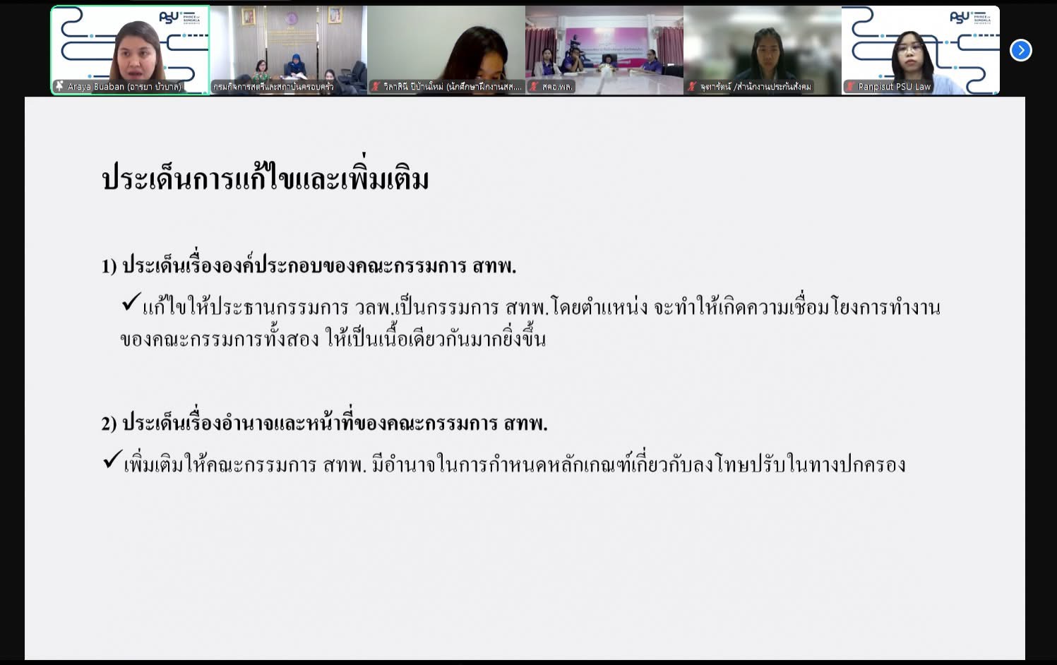 วันที่ 19 มีนาคม 2568 กรมกิจการสตรีและสถาบันครอบครัว ร่วมกับคณะนิติศาสตร์ มหาวิทยาลัยสงขลานครินทร์ จัดประชุมรับฟังความคิดเห็นเพื่อแก้ไขและเพิ่มเติมพระราชบัญญัติความเท่าเทียมระหว่างเพศ พ.ศ. 2568 โดยนางสุดา สุหลง รองอธิบดีกรมกิจการสตรีและสถาบันครอบครัว เป็นประธานการประชุมฯ เพื่อปรับปรุงปรุงมาตรการคุ้มครองผู้ถูกเลือกปฏิบัติโดยไม่เป็นธรรมระหว่างเพศ และป้องกันไม่ให้มีการเลือกปฏิบัติโดยไม่เป็นธรรมระหว่างเพศ ในการนี้ นายนัธทวัฒน์ ธนโชติชัยพัชร์ ผู้อำนวยการศูนย์เรียนรู้การพัฒนาสตรีและครอบครัวเฉลิมพระเกียรติสมเด็จพระเทพฯ 36 พรรษา จังหวัดชลบุรี มอบหมายให้นางสิราณี คิดหาทอง นักสังคมสงเคราะห์ เข้าร่วมประชุมฯ ผ่านระบบ Zoom Meeting