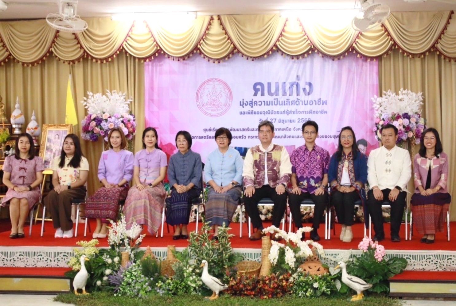 วันที่ 27 มิถุนายน 2568 ณ ศูนย์เรียนรู้การพัฒนาสตรีและครอบครัวภาคเหนือ จ.ลำปาง นางสาวนิติยา พงษ์พานิช รองผู้ว่าราชการจังหวัดลำปาง เป็นประธานในพิธีมอบรางวัลชนะเลิศกิจกรรมคนเก่งมุ่งสู่ความเป็นเลิศด้านอาชีพ และพิธีมอบวุฒิบัตรผู้สำเร็จการฝึกอบรมในสถาบัน โดยมีนางศรีสุดา เถาเมืองใจ พัฒนาสังคมและความมั่นคงของมนุษย์จังหวัดลำปาง เข้าร่วมเป็นเกียรติในพิธีฯ ในการนี้ นายนัธทวัฒน์ ธนโชติชัยพัชร์ ผู้อำนวยการศูนย์เรียนรู้การพัฒนาสตรีและครอบครัวเฉลิมพระเกียรติสมเด็จพระเทพฯ 36 พรรษา จังหวัดชลบุรี พร้อมด้วยนางรินทร์ปภัส เรืองเชาว์หิรัณ นักพัฒนาสังคมชำนาญการ เข้าร่วมเป็นเกียรติในพิธีดังกล่าว