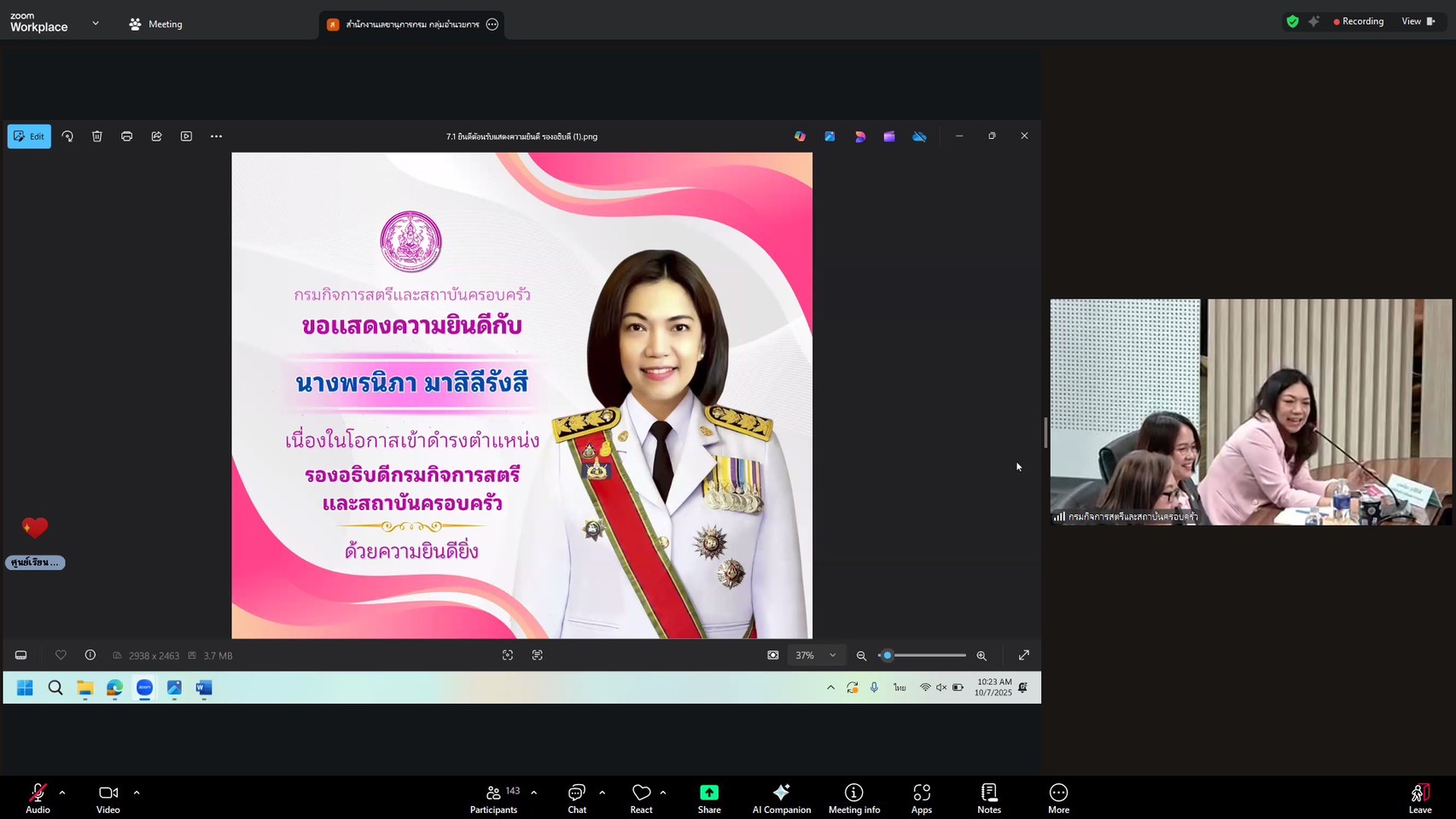 วันที่ 7 ตุลาคม 2568 เวลา 09.30 น. นางสาวแรมรุ้ง วรวัธ อธิบดีกรมกิจการสตรีและสถาบันครอบครัว เป็นประธานการประชุมกรมกิจการสตรีและสถาบันครอบครัว ประจำเดือนตุลาคม 2568 ครั้งที่ 1/2569 เพื่อรายงานแผนการขับเคลื่อนการดำเนินงาน และงบประมาณที่ได้รับการจัดสรรในปีงบประมาณ 2569 ให้มีประสิทธิภาพ และเกิดผลสัมฤทธิ์ ในการนี้ นายนัธทวัฒน์ ธนโชติชัยพัชร์ ผู้อำนวยการศูนย์เรียนรู้การพัฒนาสตรีและครอบครัวเฉลิมพระเกียรติสมเด็จพระเทพฯ 36 พรรษา จังหวัดชลบุรี พร้อมด้วยข้าราชการและเจ้าหน้าที่ เข้าร่วมประชุมผ่านระบบ Zoom Meeting