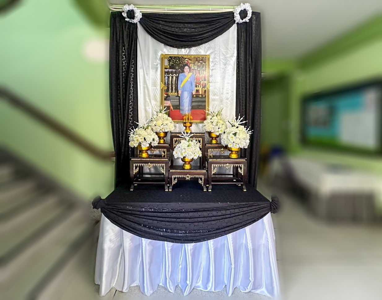 วันที่ 28 ตุลาคม 2568 ณ ศูนย์เรียนรู้การพัฒนาสตรีและครอบครัวเฉลิมพระเกียรติสมเด็จพระเทพฯ 36 พรรษา จังหวัดชลบุรี นายนัธทวัฒน์ ธนโชติชัยพัชร์ ผู้อำนวยการศูนย์ฯ มอบหมายให้ฝ่ายบริหารงานทั่วไป ดำเนินการจัดตั้งโต๊ะหมู่บูชาประดิษฐานพระฉายาลักษณ์ สมเด็จพระนางเจ้าสิริกิติ์ พระบรมราชินีนาถ พระบรมราชชนนีพันปีหลวง พร้อมเครื่องสักการะ เครื่องทองน้อยประดับผ้าดำขาว พานแจกันดอกไม้ พานพุ่มดอกไม้ เพื่อน้อมรำลึกในพระมหากรุณาธิคุณ สมเด็จพระนางเจ้าสิริกิติ์ฯ