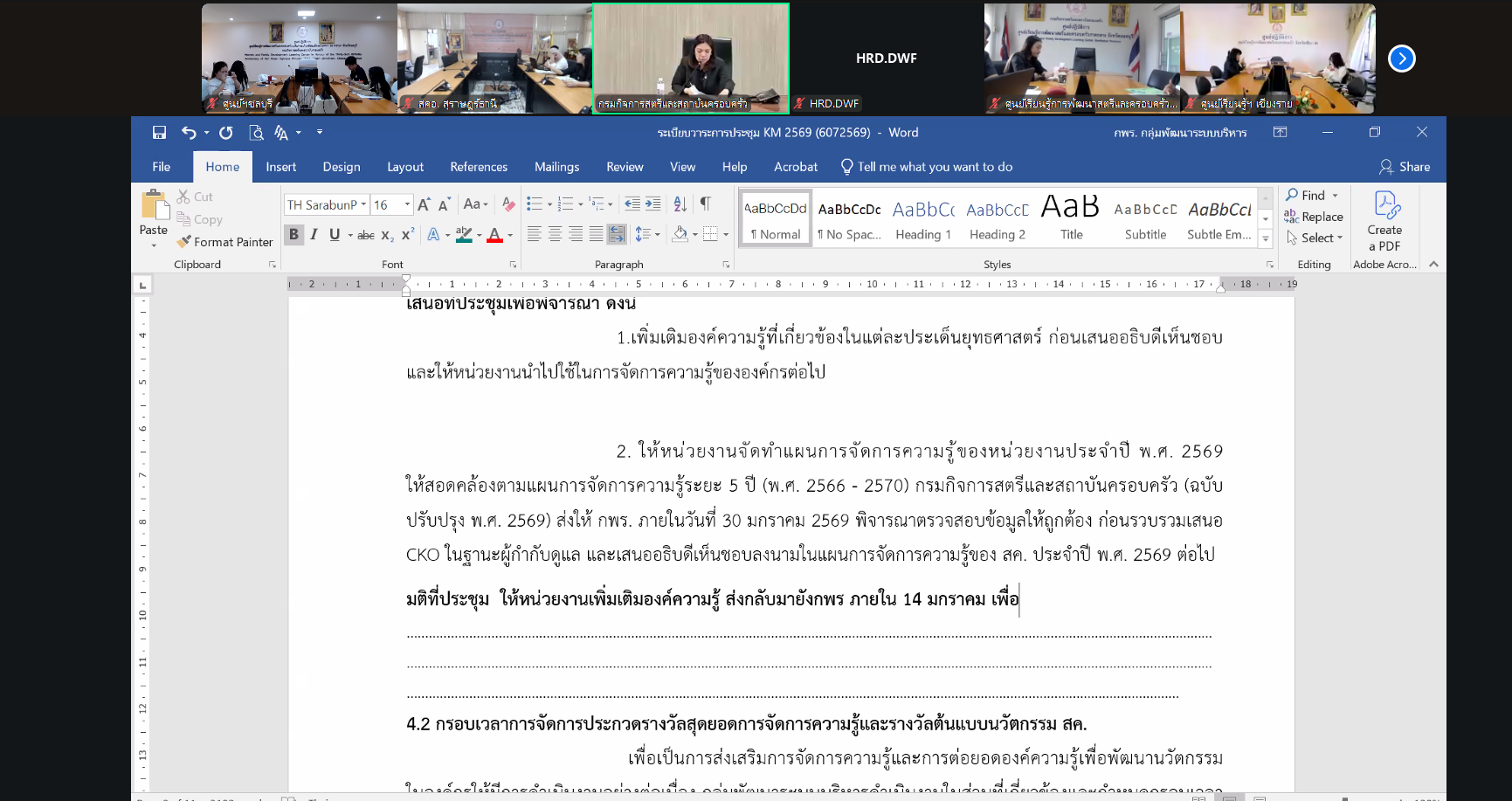 วันที่ 7 มกราคม 2569 เวลา 13.30 น. นางพรนิภา มาสิลีรังสี รองอธิบดีกรมกิจการสตรีและสถาบันครอบครัว เป็นประธานในการประชุมคณะทำงานพัฒนาระบบบริหารจัดการความรู้ ครั้งที่ 1/2569 โดยมีวัตถุประสงค์เพื่อรายงานผลการดำเนินงาน การจัดการความรู้ประจำปีงบประมาณ พ.ศ. 2568 และพิจารณาแนวทางการดำเนินงานการจัดการความรู้ ประจำงบประมาณ พ.ศ. 2569 ในการนี้ นางรินทร์ปภัส เรืองเชาว์หิรัณ นักพัฒนาสังคมชำนาญการ รักษาการในตำแหน่ง ผู้อำนวยการศูนย์เรียนรู้การพัฒนาสตรีและครอบครัวเฉลิมพระเกียรติสมเด็จพระเทพฯ 36 พรรษา จังหวัดชลบุรี มอบหมายให้ข้าราชการและเจ้าหน้าที่ เข้าร่วมประชุมผ่านระบบ Zoom Meeting