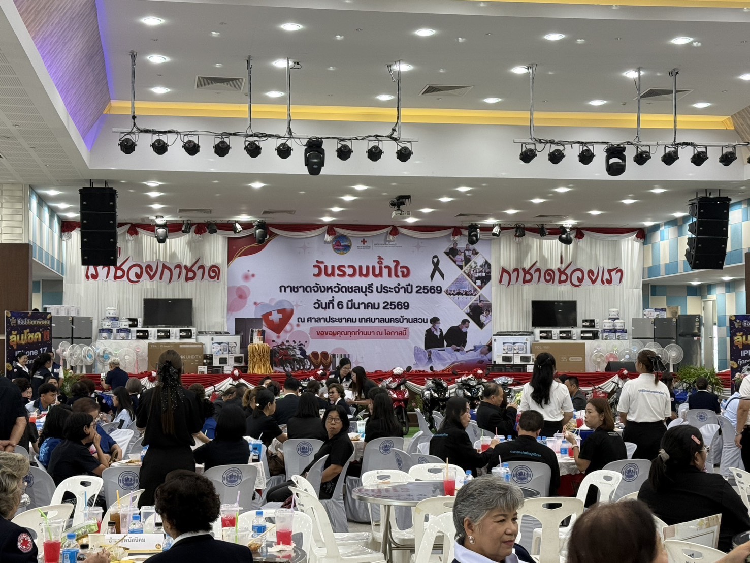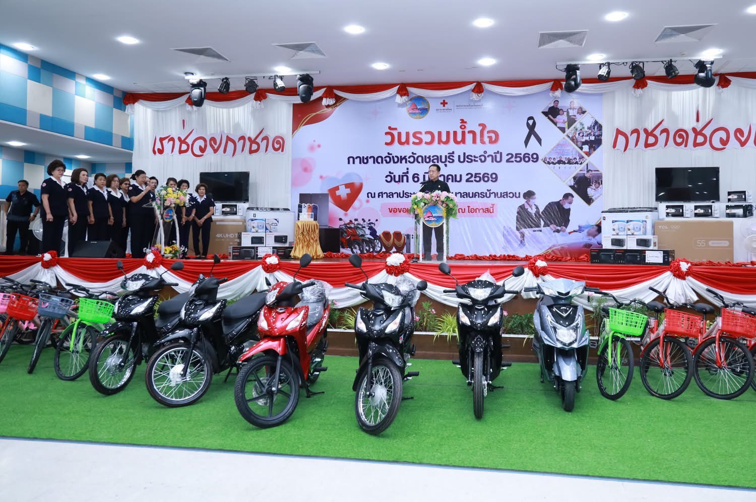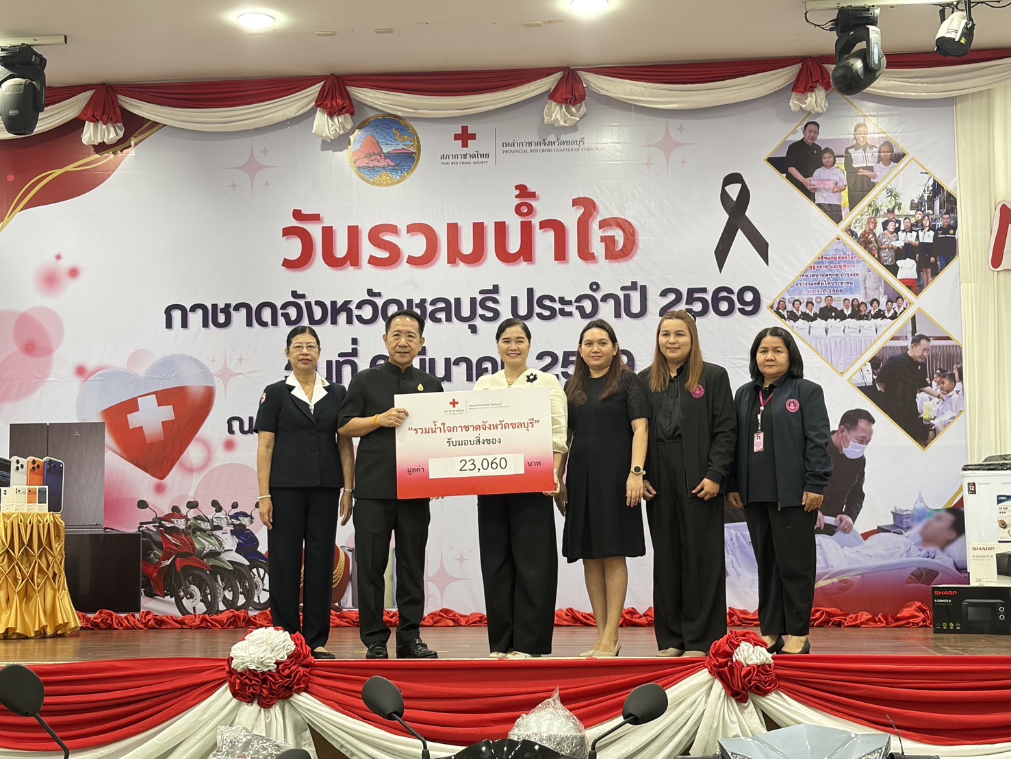วันที่ 6 มีนาคม 2569 เวลา 09.00 น. ณ ศาลาประชาคมเทศบาลนครบ้านสวน อำเภอเมืองชลบุรี จังหวัดชลบุรี นายนริศ นิรามัยวงศ์ ผู้ว่าราชการจังหวัดชลบุรี เป็นประธานในพิธีเปิดกิจกรรม “วันรวมน้ำใจ” พร้อมด้วยนางสุพิณญา นิรามัยวงศ์ นายกเหล่ากาชาดจังหวัดชลบุรี และหน่วยงานภาครัฐภาคเอกชน เพื่อรับมอบสิ่งของและทุนทรัพย์จากหน่วยงานภาครัฐ ภาคเอกชน องค์กรปกครองส่วนท้องถิ่น และประชาชนผู้มีจิตศรัทธา สำหรับนำไปใช้ในการออกร้านมัจฉากาชาด ในงานนมัสการพระพุทธสิหิงค์และงานสงกรานต์จังหวัดชลบุรี ประจำปี 2569 ซึ่งกำหนดจัดขึ้นระหว่างวันที่ 10 – 18 เมษายน 2569 โดยมีวัตถุประสงค์เพื่อระดมทรัพยากรและทุนทรัพย์ในการสนับสนุนภารกิจสาธารณกุศลของเหล่ากาชาดจังหวัดชลบุรี โดยรายได้จากการจัดงานจะนำไปขับเคลื่อนโครงการสงเคราะห์ในด้านต่างๆ อาทิ การช่วยเหลือกลุ่มเปราะบาง ผู้ตกทุกข์ได้ยาก ผู้สูงอายุ ผู้ป่วยติดเตียง และเด็กนักเรียนที่ขาดแคลนทุนทรัพย์ในพื้นที่จังหวัดชลบุรี ในการนี้ นางรินทร์ปภัส เรืองเชาว์หิรัณ นักพัฒนาสังชำนาญการ รักษาการในตำแหน่ง ผู้อำนวยการศูนย์เรียนรู้การพัฒนาสตรีและครอบครัวเฉลิมพระเกียรติสมเด็จพระเทพฯ 36 พรรษา จังหวัดชลบุรี พร้อมด้วยนางสาวนัฐถา เจริญผล เจ้าพนักงานธุรการ เข้าร่วมงาน