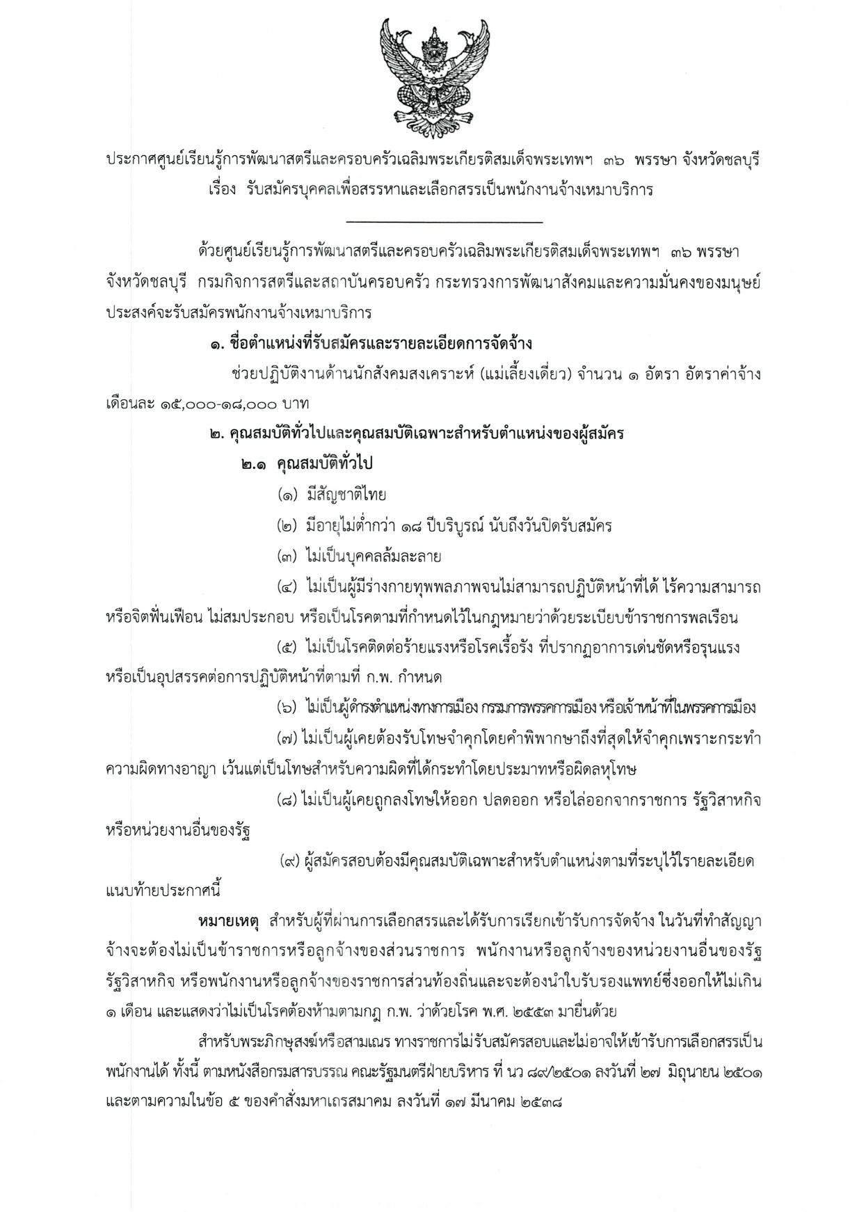 ประกาศศูนย์เรียนรู้การพัฒนาสตรีและครอบครัวเฉลิมพระเกียรติสมเด็จพระเทพฯ 36 พรรษา จังหวัดชลบุรี รับสมัครเพื่อสรรหาและเลือกสรรเป็นพนักงานจ้างเหมาบริการ