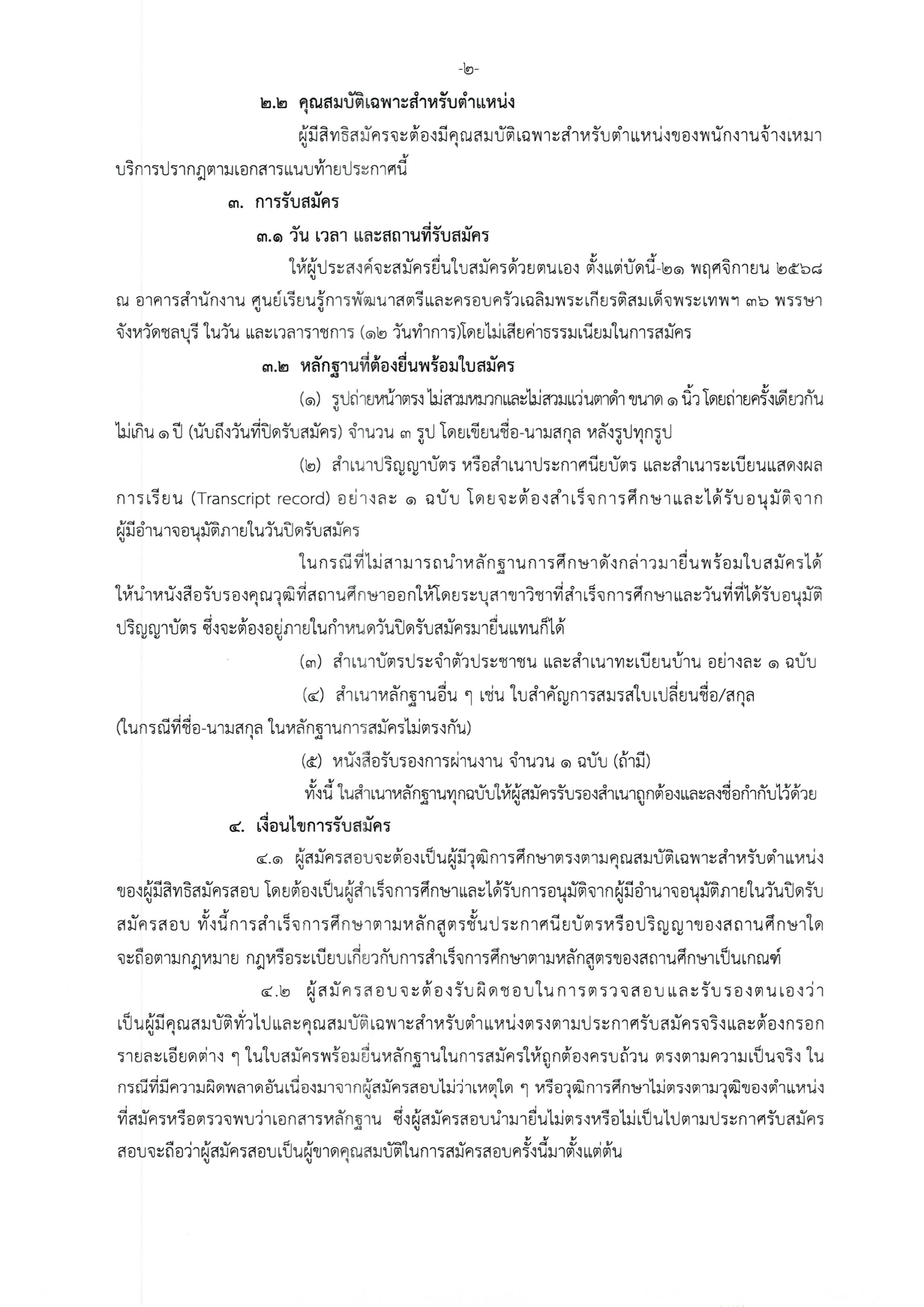 ผู้ประสงค์จะสมัครยื่นใบสมัคร ได้ตั้งแต่บัดนี้ – 21 พฤศจิกายน 2568 ณ อาคารสำนักงานศูนย์เรียนรู้การพัฒนาสตรีและครอบครัวเฉลิมพระเกียรติสมเด็จพระเทพฯ 36 พรรษา จังหวัดชลบุรี ในวันและเวลาราชการ (12 วันทำการ) โดยไม่เสียค่าธรรมเนียมในการสมัคร