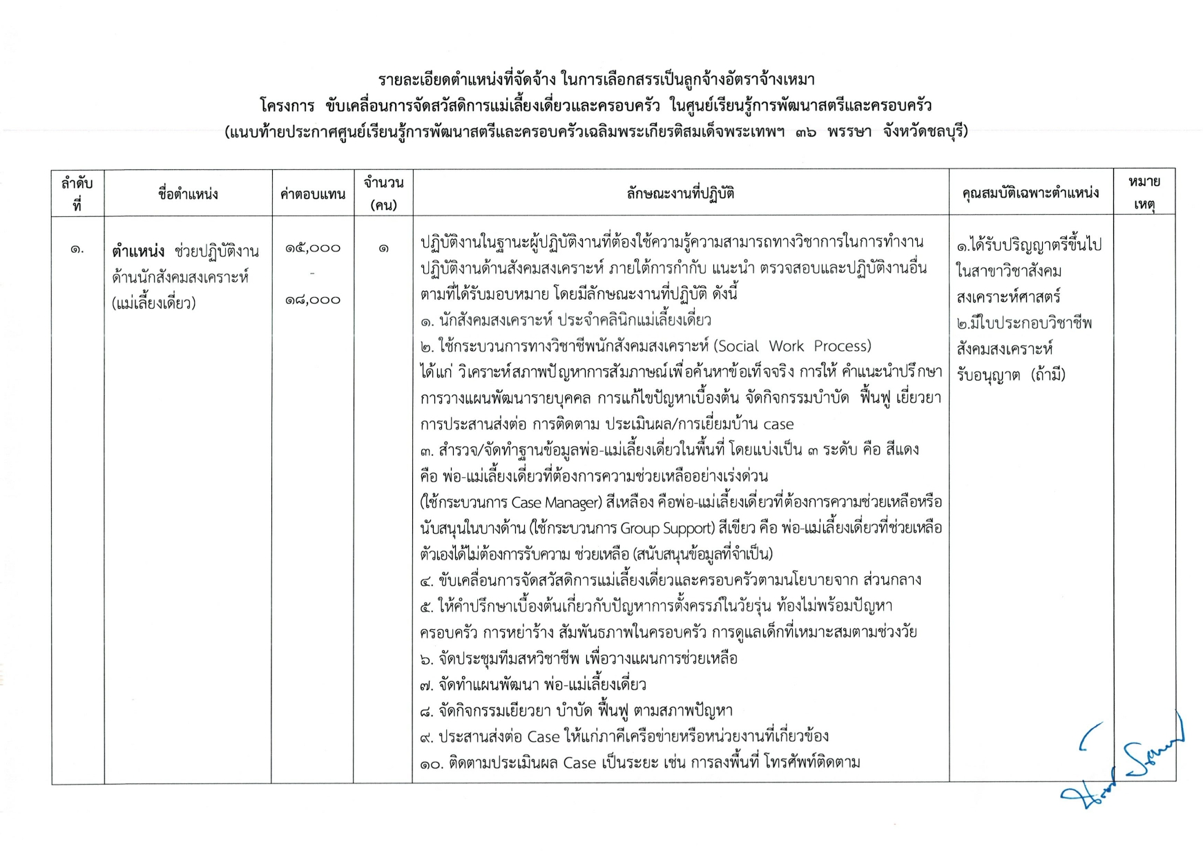 ตำแหน่งช่วยปฏิบัติงานด้านนักสังคมสงเคราะห์ (แม่เลี้ยงเดี่ยว) จำนวน 1 อัตรา