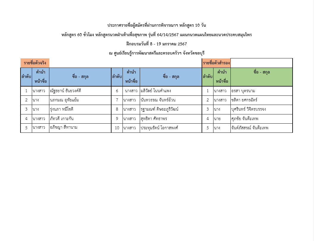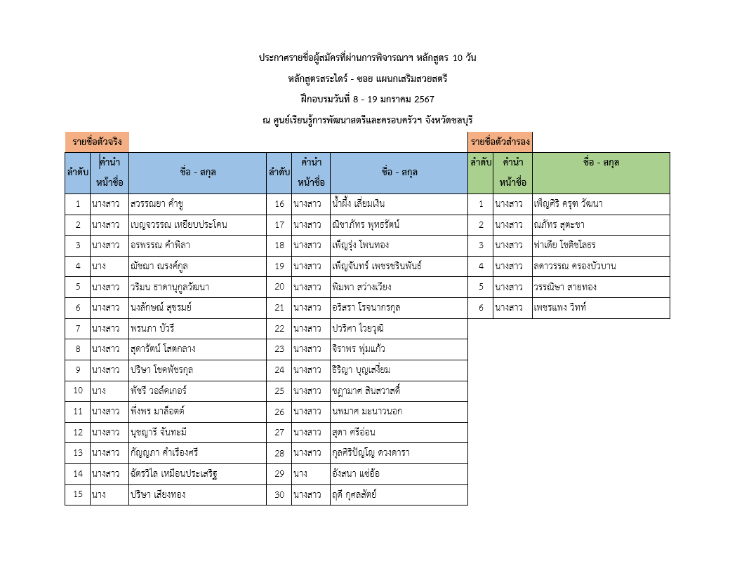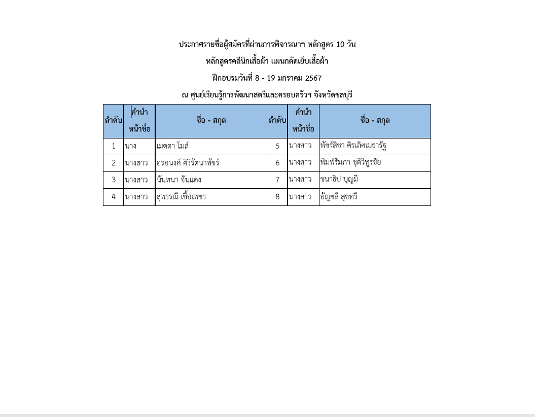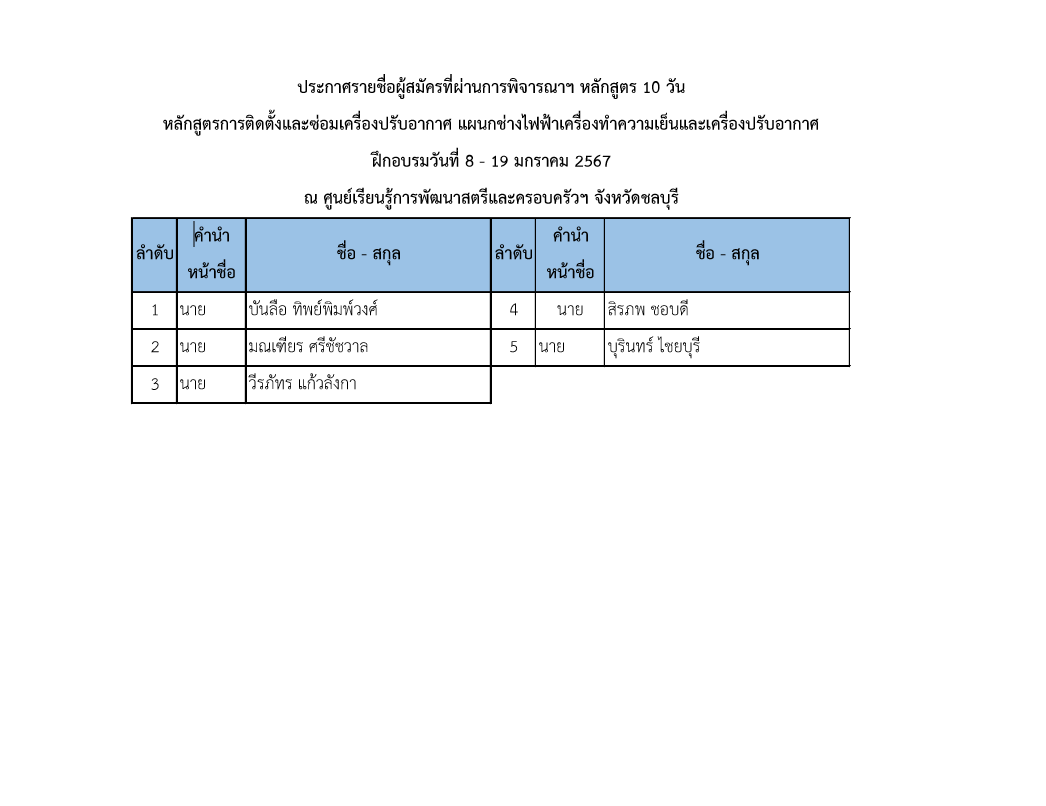 ประกาศรายชื่อผู้มีสิทธิเข้ารับการฝึกอบรม หลักสูตร 10 วัน (วันที่ 8 – 19 มกราคม 2567)