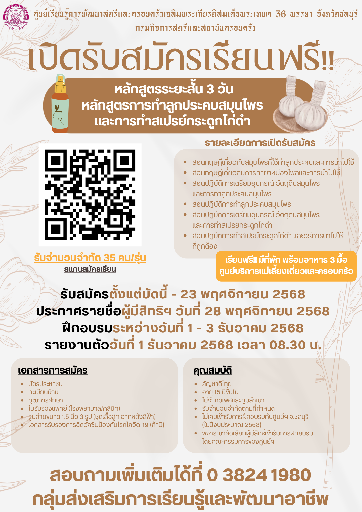หลักสูตร การทำลูกประคบสมุนไพร และการทำสเปร์ยกระดูกไก่ดำ กด https://forms.gle/qMzMJGkZwjUZEzCw6