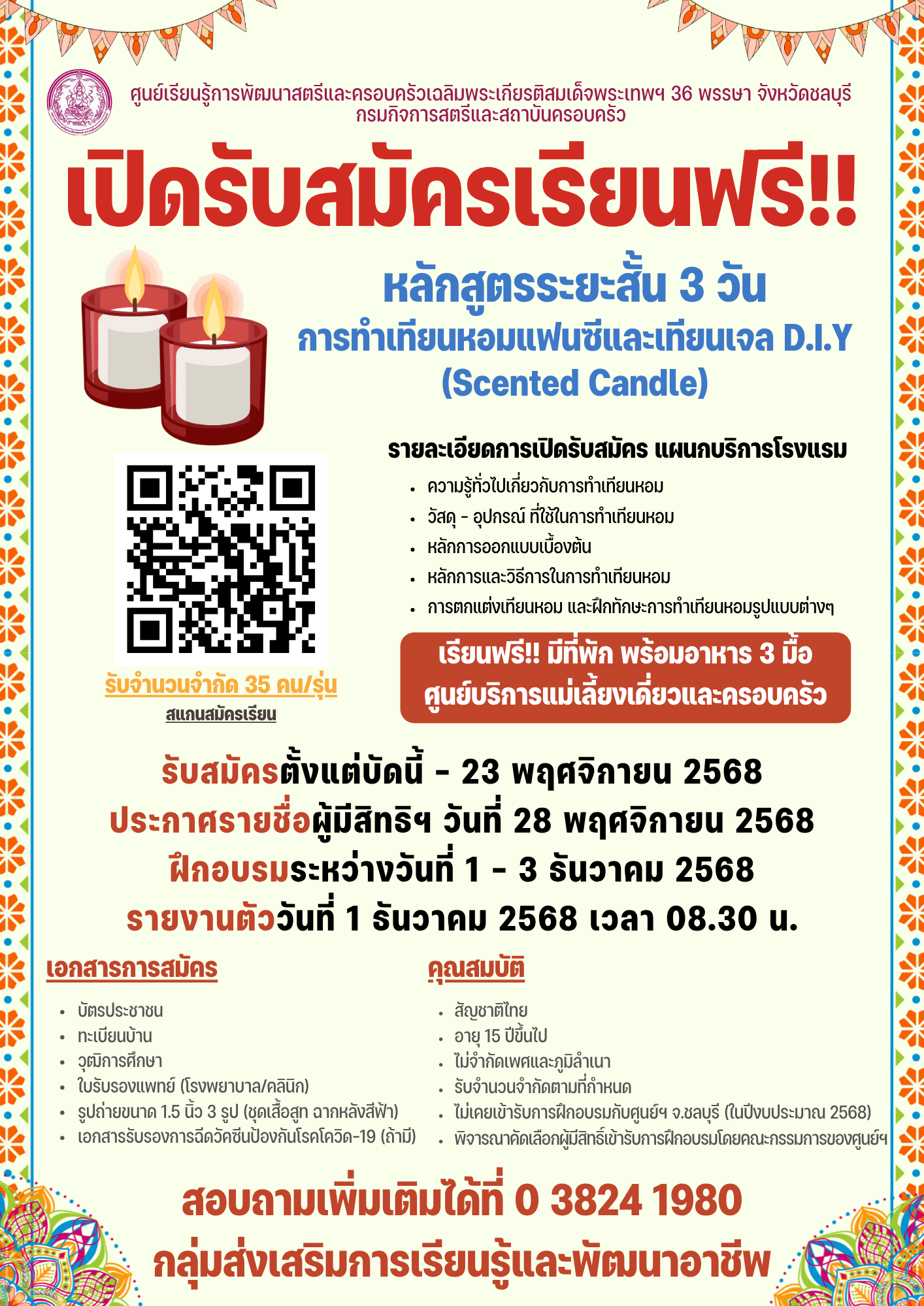 หลักสูตร การทำเทียนหอมแฟนซีและเทียนเจล D.I.Y กด https://forms.gle/PhrkmtSFsxL7R5T97